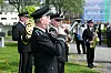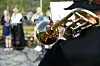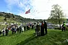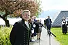 Minnemarkering på Straumhaugen i Norheimsund for falne i krigen. Håkon Valland tala før kransenedlegginga. Trombonen til Olav Skeie Lid speglar flagget.