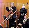 «Ein kan ikkje anna enn å beundra Arild B. Nilsen for arbeidet han har gjort med dette orkesteret», skriv Kjell Reidar Huus om Hardanger Big Band etter konserten i Øystese. Her ser me nokre av messingblåsarane. Frå venstre: Olai Mostad (framme), Kjell Sekse, Mette Fonneland og Grete Lillefosse.