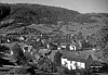 Utsyn over Norheimsund i 1917 med nokre av husa langs Gamle Sandvenvegen i forgrunnen. Frå høgre ser me bustadhuset og løa i Gjermundsgarden, og Sara Sunde-huset lengst til venstre.