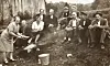 Fra høyre: Yngstesønnen Lars Steine, faren Ola O. Steine (Gamle-Ola eller «Ingolen» på folkemunne), (?) Ullestad, Einar Steine, eldstesønnen Ola («Vetle-Ola») Steine, Ola Lundanes, Margit Steine (gift med Einar), Alida (som for en gangs skyld hadde fri), Herborg Lundanes (gift med Ola) og budeien Torbjørg Sekse. Sistnevnte øser opp rømmegrøt fra «den sorte gryte».