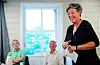 Staseleg: – Dette er stas, sa Sidsel Haugen, som hadde pynta seg for høvet då prosjektet Hjelp ein sambygding vart presentert i Øystese bedehus onsdag. Bak ser me Olav Tombre (t.v.) i Lions i Strandebarm, som har drive eit tilsvarande prosjekt, og Hans Atle Soldal i eit av medspelarlaga i prosjektet, nemleg Øystese sokneråd.