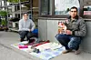 Ekteparet George Manolaki (30) og Maria Ofelia Preda (28) frå Romania er i Kvam for å selja Folk er folk og strikketøy. Redaktøren i bladet meiner politiet i Kvam bommar i tolkinga av reglane for opphald på offentleg stad. Arkivfoto: Vilde Grimelid Oppedal