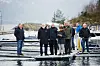 17. mars var tingretten på synfaring i Skutevik for å sjå på hamneanlegget og eigedomane ikring. Til venstre står leiar i båtlaget, Olav Arne Økland. Fremst til høgre ser me domarfullmektig Siv Hamstad Haukelidsæter, som skal ta avgjerd i saka.