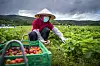 Ein vietnamesisk jordbærplukkar i åkeren til jordbærbonde Per Isingrud ved Minnesund. Isingrud gjekk saman med andre jordbærbønder om å chartre eit fly med arbeidarar frå Asia for å skaffe nok arbeidskraft. Foto: Heiko Junge / NTB scanpix / NPK