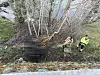 Her låg køyretøyet etter hendinga. Her ser me Anders Sæleset og Jahn Tolo (t.h.) i sving med å sikra det.