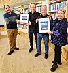 Åsmund Kristiansen (nummer to f.v.) og Sjur Tarjei Fykse tek imot utmerkinga som årets verksemd frå avtroppande styreleiar Tone Søgaard (t.h.) og ny styreleiar Lars Kristian Bu (t.v.) i Kvam Næringsråd. Vinnaren fekk eit måleri laga av Randi Hjemlestad og eit diplom.