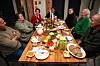 Før jul samlast nokre av dei sentrale kreftene til julelunsj i 2. etasje i Frivillighuset. Frå venstre: Johannes Byrkjeland, Hanne Hesthamar, Kristin Lundblad, Siv Larsen Vik, Marin Jean Tjongsbotnen, Jan Frank Bøe og Frode Skurtveit. Det solide matbordet vart funne i kjellaren, heilt svart av skit og slitasje.