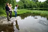 Frå venstre: Katharina Fagerhaug Sommerfelt, Carolina Fagerhaug Sommerfelt og Kristin Fagerhaug såg skiltet som varsla om «Gullfiskdammen» ved Fyksesundbrua, og lét ikkje sjansen gå frå seg då dei var på veg frå aust mot vest juli. Dei måtte konstatera at endene verka meir glupske enn vederbukane då dei kasta brødbitar uti vatnet.
