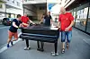 Kyrkjeverje Olav Skeie Lid (t.h.) varslar ei mogeleg oppgradering av flygelet i kyrkja. Her er han i sving med å flytta eit flygel saman med Ragnar Hansen (t.v.), Jostein Solberg og Arne Flotve i samband med ei utgåve av Hardingtonar.