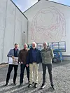 Prosjektgruppa for Fosse-senteret i Haugesund framfor det påbyrja veggmåleriet av Jon Fosse. F.v. Arkitekt Inge Hareide, teatersjef Morten Joachim ved Haugesund teater, Sigurd Aase entreprenør og Simon Næsse kommunaldirektør for kultur, idrett og frivilligheit.