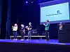 Kvam fekk tildelt gjæv pris. Frå venstre: utekontakt Siriann Lillevik, Sara Petrine Coucheron Fykse i Ungdomsrådet og Sondre Fagerheim Lunestad i elevrådet på Kvam ungdomsskule. Til høgre står statsråd i Barne- og familiedepartementet, Kjersti Toppe (Sp), som delte ut prisen.