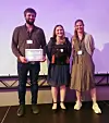 Frå venstre: Kristian Aarhus, leiar i Vikøy og Øystese Bondelag, saman med styremedlemene Johanne Neteland og Guro Stuve og mogelegvis ein framtidig bonde Her er dei med provet på utmerkinga. Premien er 10 000 kroner.