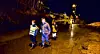 Fysj: David (t.v.) og Julia (t.h.) Skåre Døssland og naboen Christoffer Haukaas regelrett vassa i gylle på fylkesvegen forbi husa deira. I bakgrunnen ser me huset til Christoffer og familien, der pappa Tore og bestefar Lars Knut arbeidde for å leia mest mogeleg av skiten vekk. – Me fekk i alle fall gjødsla plenen vår, seier David.