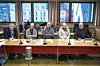 Mannsterke: Ein stor delegasjon frå Kvam herad hadde funne vegen til møtet i fylkeshuset i Bergen. Framme, frå venstre: Ottar Randa (H), Herleif Tveit (Sp), Frode Nygård (Frp), varaordførar Heidi Sandven Botnen (KrF) og ordførar Jostein Ljones (Sp). Bak, frå venstre: Plan og byggesakssjef Heidi Ørjansen, Kari Mostad (MDG), planleggjar Leiv Kvaale og Borghild S. Ones (Ap).
