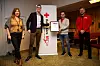 Frå venstre: Banksjefane Mariann Bjorøy og Morten Skaathun Nilsen i SR-Bank overrekte gåvebrevet til leiar Andreas Jacobsen i Øystese Røde Kors Hjelpekorps. Til høgre står fungerande dagleg leiar Thorbjørn Fosse i Hordaland Røde Kors.