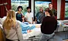 Tuva Aksnes (t.v.) og Nora Fonneland (t.h., med ryggen til) viste elevar frå teknologi- og industrifag korleis dei kan bandasjera sårskadar. Frå venstre: Emil Toreid, Nantawat Duangkaew, Anita Elisabet Flo og Storm Rosseland.