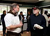 Arjen L.H. Stolk (t.h.) og Marna Roer meiner av fylgjene av dei planlagde byggjetiltaka ved Mowi-anlegget vert konsekvensutgreidde. Dei fryktar at butikken kan lida av dei som fylgje av nedgang i turismen. Her er Stolk i samtale med Ove-Henning Bjørsvik i samband med opninga av butikken i 2018.
