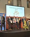 Frå utdelinga av prisen Årets nynorskkommune 2020.Frå venstre kulturminister Abid Q. Raja, ordførar i Voss herad Hans-Erik Ringkjøb, rådmann Arild McClellan Steine, stabssjef for innbyggjarservice Tor Halvorsen og klima- og miljøminister Sveinung Rotevatn.Foto: Språkrådet
