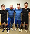 Spelande trenar Eivind Madsen Skeie meiner at desse spelarane spela godt då Kvam Futsal tevla om opprykk til eliteserien i futsal. Frå venstre: Morten Heradstveit Øyri, Raymond Aksnes, Tom Olav Olsen og Øyvind Floen Berge.