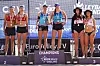 Sunniva Helland-Hansen (tredje f.v.) og Nina Pavlova kapra fyrsteplassen i Nevza Beach England 2025. Andreplassen gjekk til det norske laget Solveig Gladsøy Sunde (t.v.) og Julia Moi Tennøy. På tredjeplass kom Martha Bullen (t.h.) og Katie Keefe frå England.